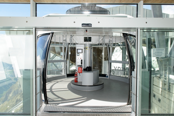 I nuovi impianti valdostani sono stati interamente concepiti, progettati e realizzati dalla Doppelmayr Italia. L’azienda di Lana ha avuto l’incarico di realizzare un impianto chiavi in mano con speciali cabine sferiche dotate di vetratura, che durante il viaggio ruotano a 360° permettendo così di godere per intero lo straordinario panorama dei Quattromila più famosi d’Europa. Gli interni delle cabine sono quanto di più moderno si possa immaginare, con vetri e pavimento riscaldati, impianto audio e schermi su cui scorrono informazioni utili e le immagini trasmesse in tempo reale da una telecamera posta sotto il pavimento. Ogni cabina inoltre è in grado di trasportare 3000 litri d’acqua da utilizzare nelle stazioni superiori.